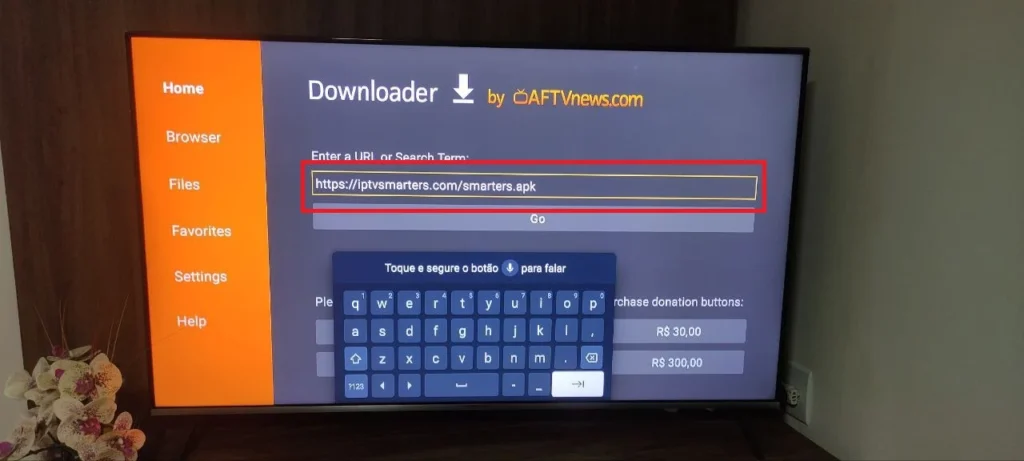 Abra o Downloader, digite o URL ou Código do aplicata do Teste de IPTV grátis (ex: APK do IPTV Smarters), caso não tenha, entre em contato clicando aqui.